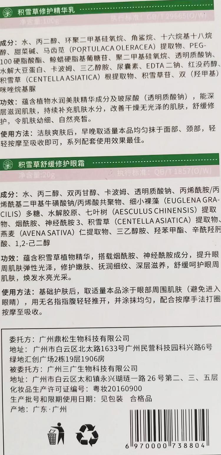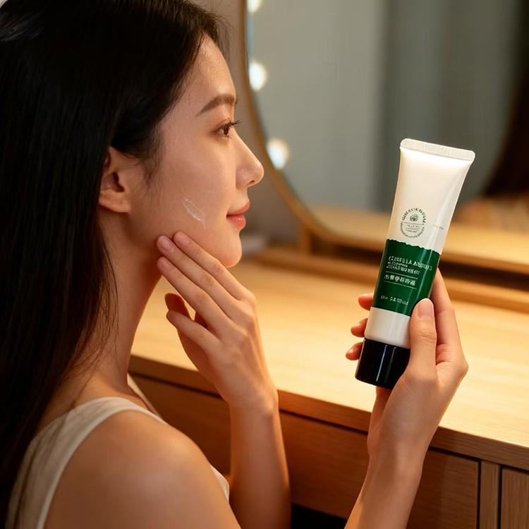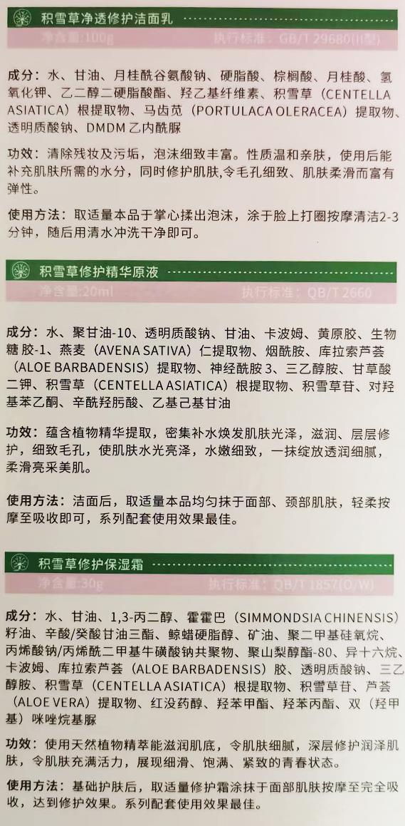 积雪草修护保湿霜:基础护肤后,取适量修护霜涂抹于面部肌肤按摩至完全吸收。