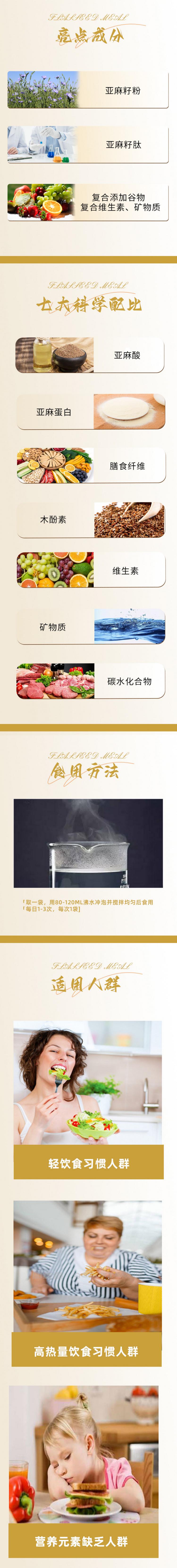 :以亚麻籽粉、亚麻籽肽等为原料,含亚麻酸、膳食纤维、木酚素及复合维生素 / 矿物质,营养维度较全。