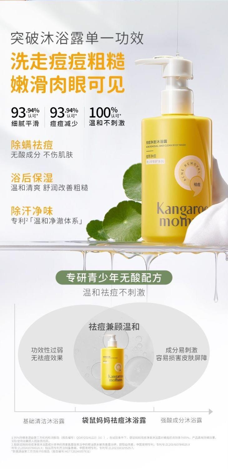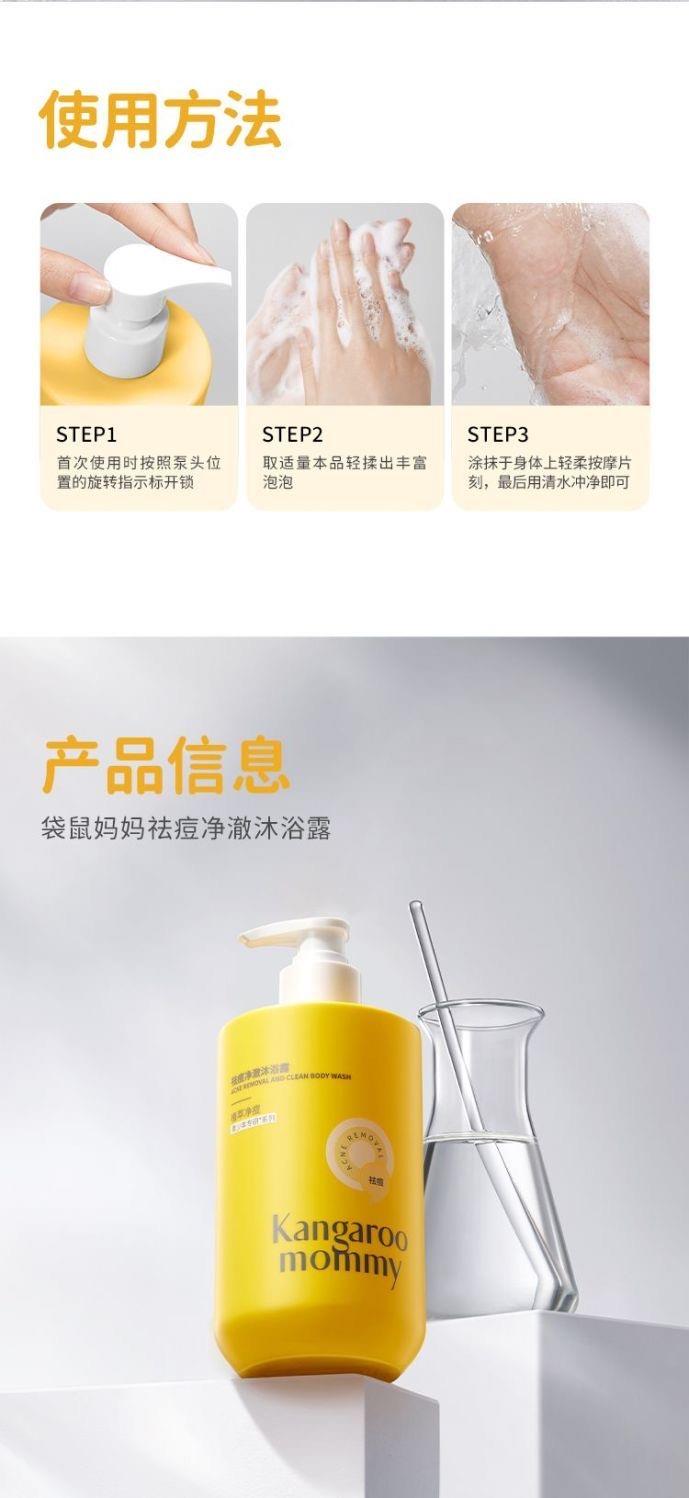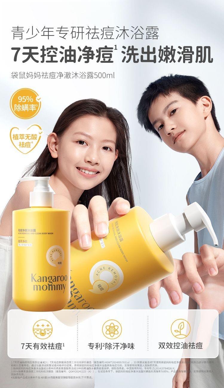 袋鼠妈妈500ml青少年祛痘净澈沐浴露学生清洁后背除螨保湿持久留香沐浴露【刮码发货 介意慎拍】